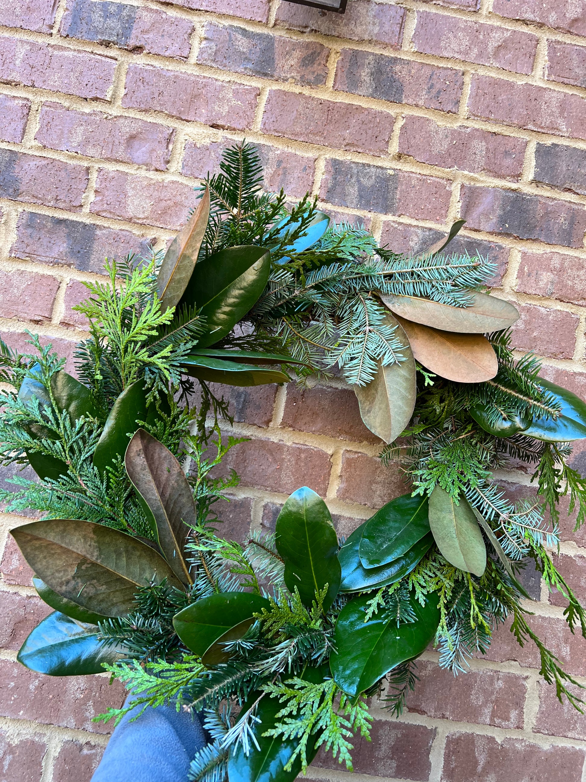 Standard circle wreath of evergreen materials with accent options that include red berries, pine cones, magnolia seed pods, magnolia leaves, Roswell calyx, blue juniper berries, cream foxglove berries, dried flowers, and hand tied bows.