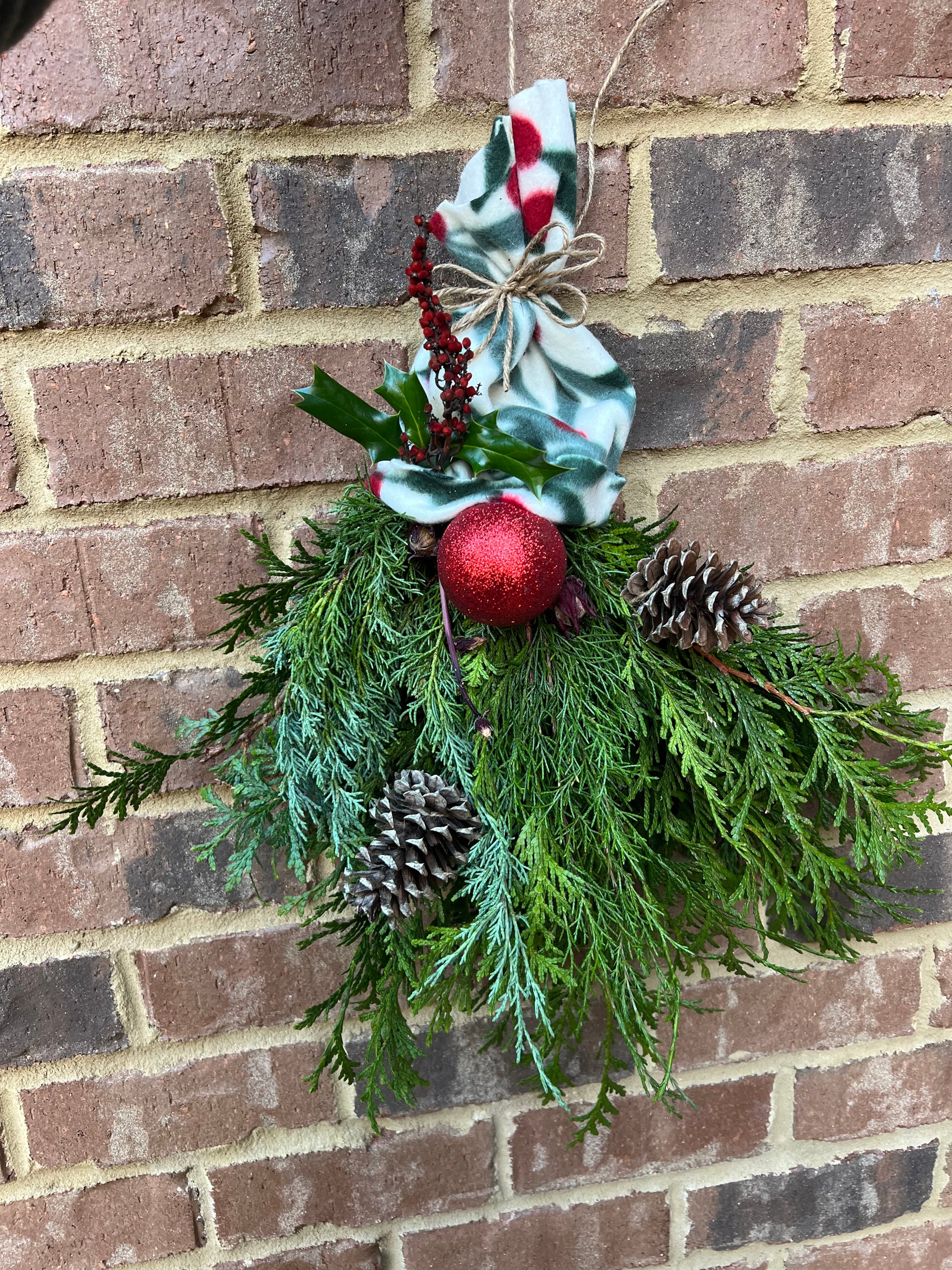 Medium sized door swag with fresh evergreens, handmade gnome hat, and red ornament for a nose.